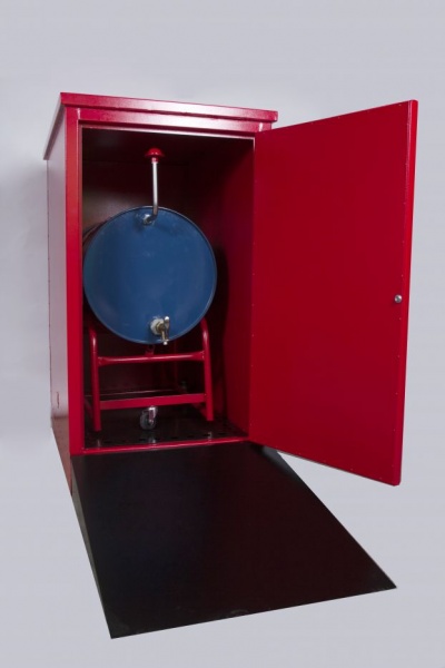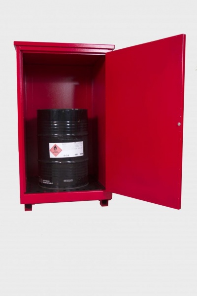 O armário corta fogo para tambores de 200 litros modelo vertical e ou horizontal são construidos com chapa de aço carbono interna e externamente, entre as chapas será preenchido com uma camada de isolante resistente. Possui abertura na parte superior e na parte inferior com duplo sistema corta chama CERTIFICADO PELA FM GLOBAL TECHNOLOGIES LLC. que funciona como respiros de ventilação para gases leves e pesados. O único armário projetado para resistir a 900 graus celsius por 1 hora. Terá uma base na parte inferior construida com perfilado de chapa U reforçado, com uma porta e travamento em 3 pontos com maçaneta e duas chaves. Este possuirá um fundo falso que funcionará como diques de contenção, teto corta fogo e pingadeira. Este armário será pintado na cor vermelho. Este armário atende as regulamentações da N.F.P.A., O.S.H.A, NR 20, NB 98, da Portaria 3214/78 e UL1275.