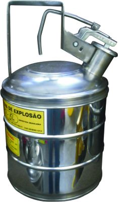Equipado com dois sistemas de corta-chamas e anti-explosão, Cone largo para descarte; Alça tipo balde na parte superior, Evita contato direto com o líquido, Possui bico de descarga para direcionamento do líquido.