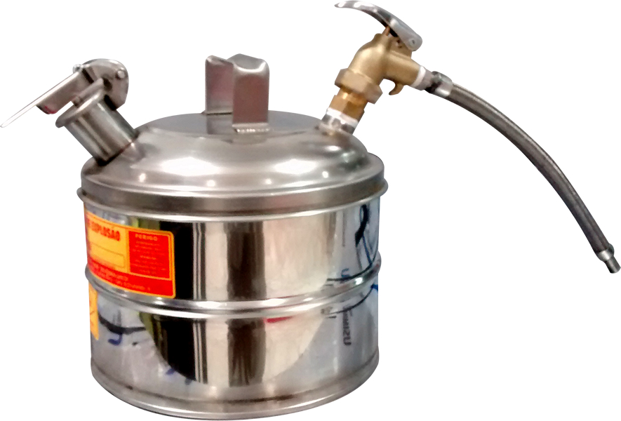 Possui válvula de descarga com extensão flexível EM AÇO INOX é equipado com dois sistemas de corta-chamas e anti-explosão, Tampa do bocal com fechamento automático, Alças ergonômicas, Evita contato direto com o líquido Facilita a transferência com rapidez e segurança, evitando o desperdício de produtos.