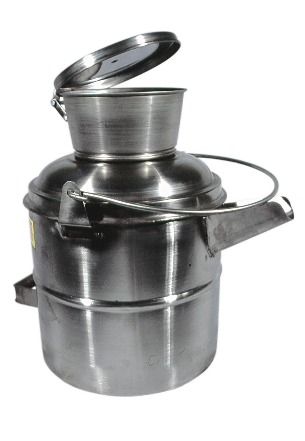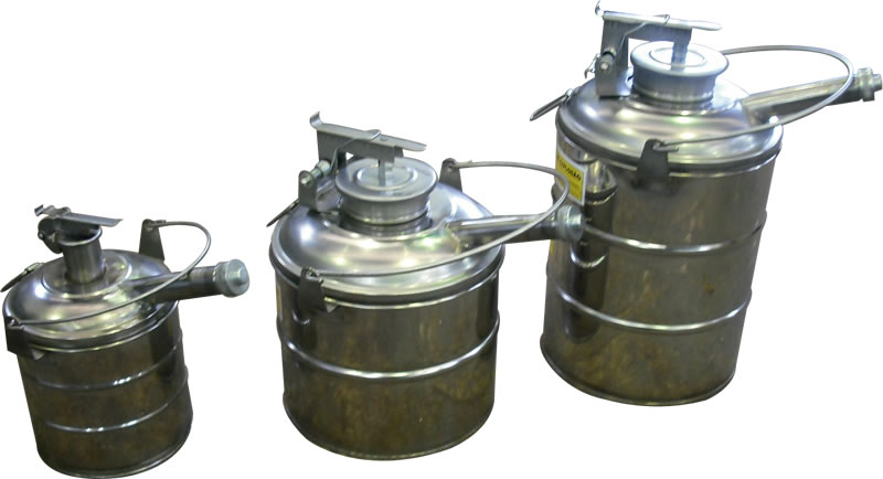 Fabricado em Aço Inox AISI 304, polido em cor natural, possui a Tampa do bocal de abastecimento em fechamento automático e um Bico metálico direcionador do líquido com tampa roscada, já os itens com capacidade igual ou abaixo de 2 litros possuem apenas um bico curto e sistema de abertura deste por alça tipo gatilho.