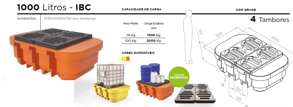 Armazene IBCs , containers de 1000 litros com o pallet de contenção que protege o meio ambiente, fabricado em Polietileno que é compatível a todos líquidos inflamáveis , combustíveis e corrosivos de mercado. Possui um amplo reservatório de 1200 litros e vão além das exigências normativas e são completamente a prova de vazamento e base com suporte acomodam uma carga de até 2000 kg distribuída uniformemente. O Pallet possui área para encaixe de empilhadeiras permitindo facilmente o transporte. São fornecidos totalmente montados.
